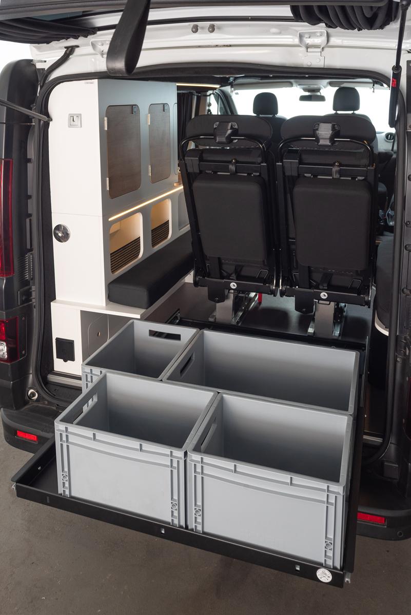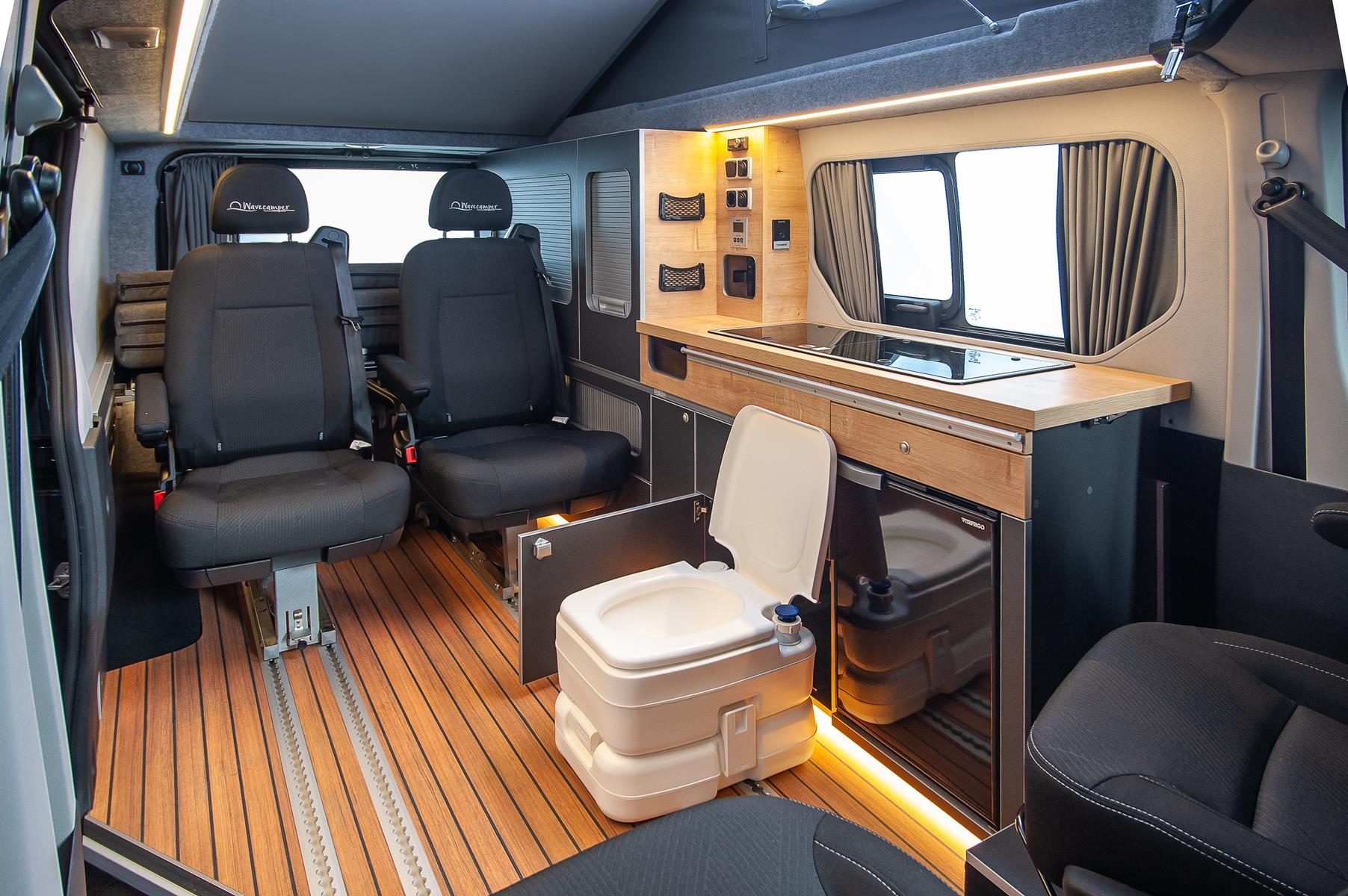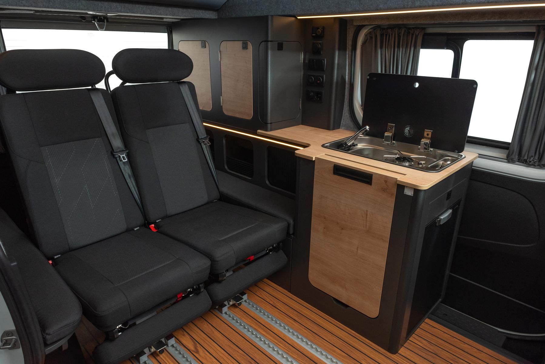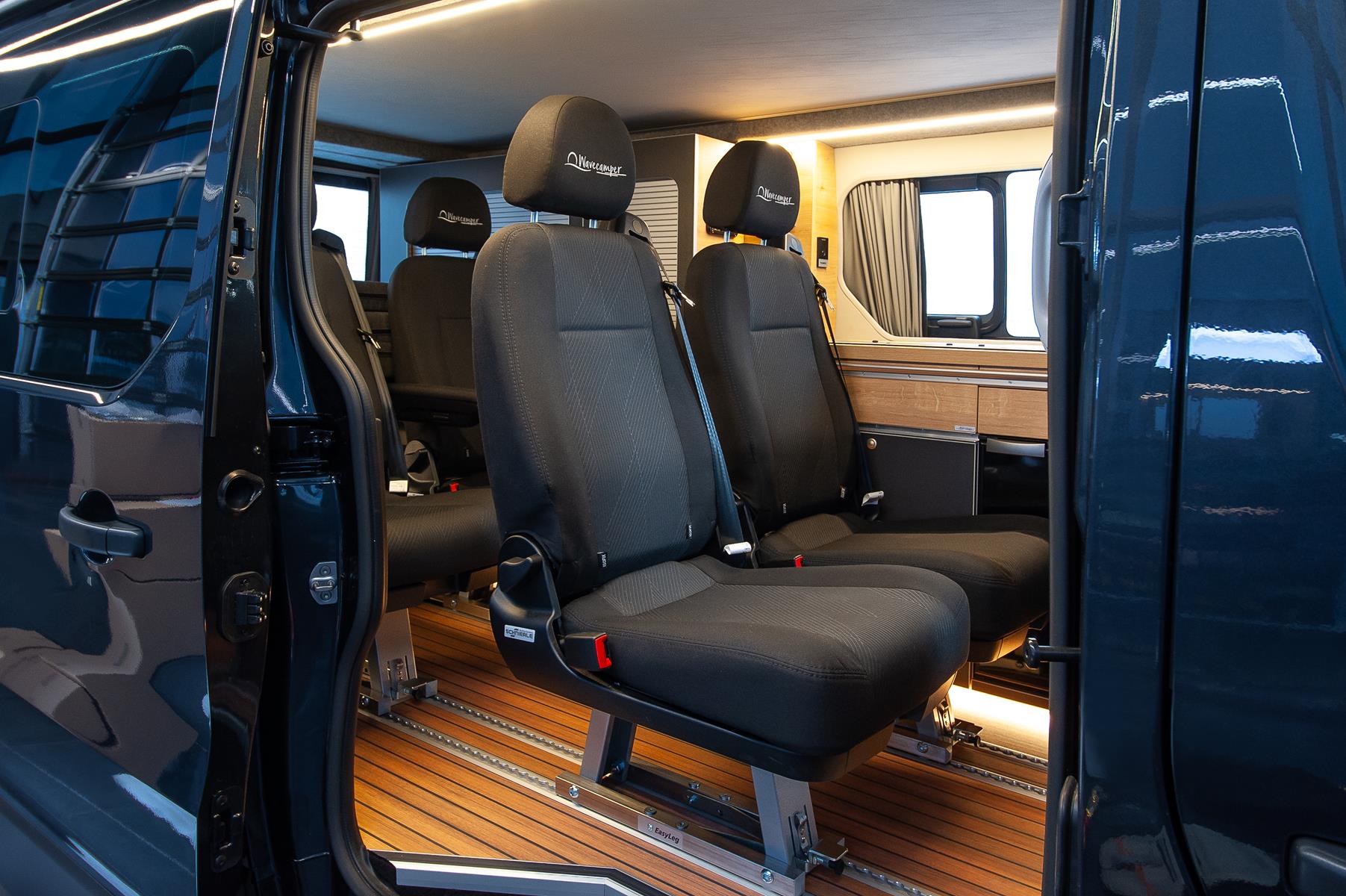 A versatile model with a rail-mounted seating system, offering multiple configurations: from a 4-person camper with 4 sleeping places to a 6-person van. By removing the seats or bed, you gain a generous space for carrying larger items.