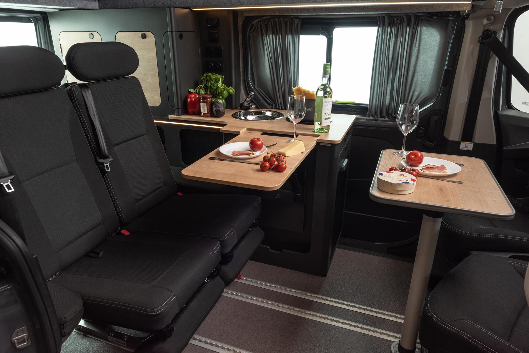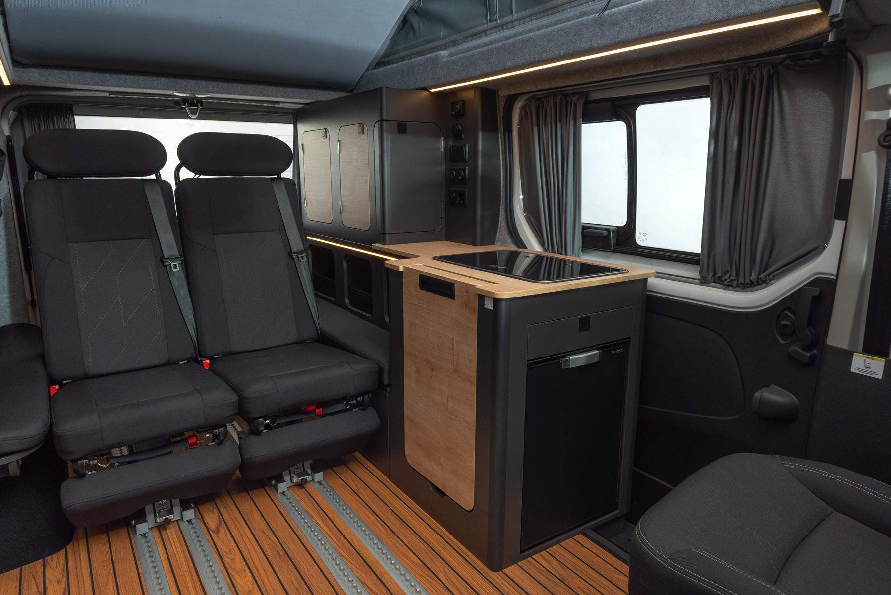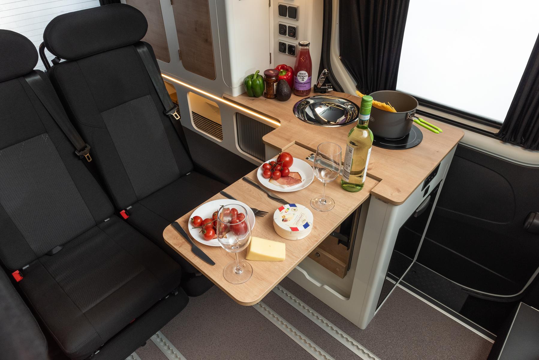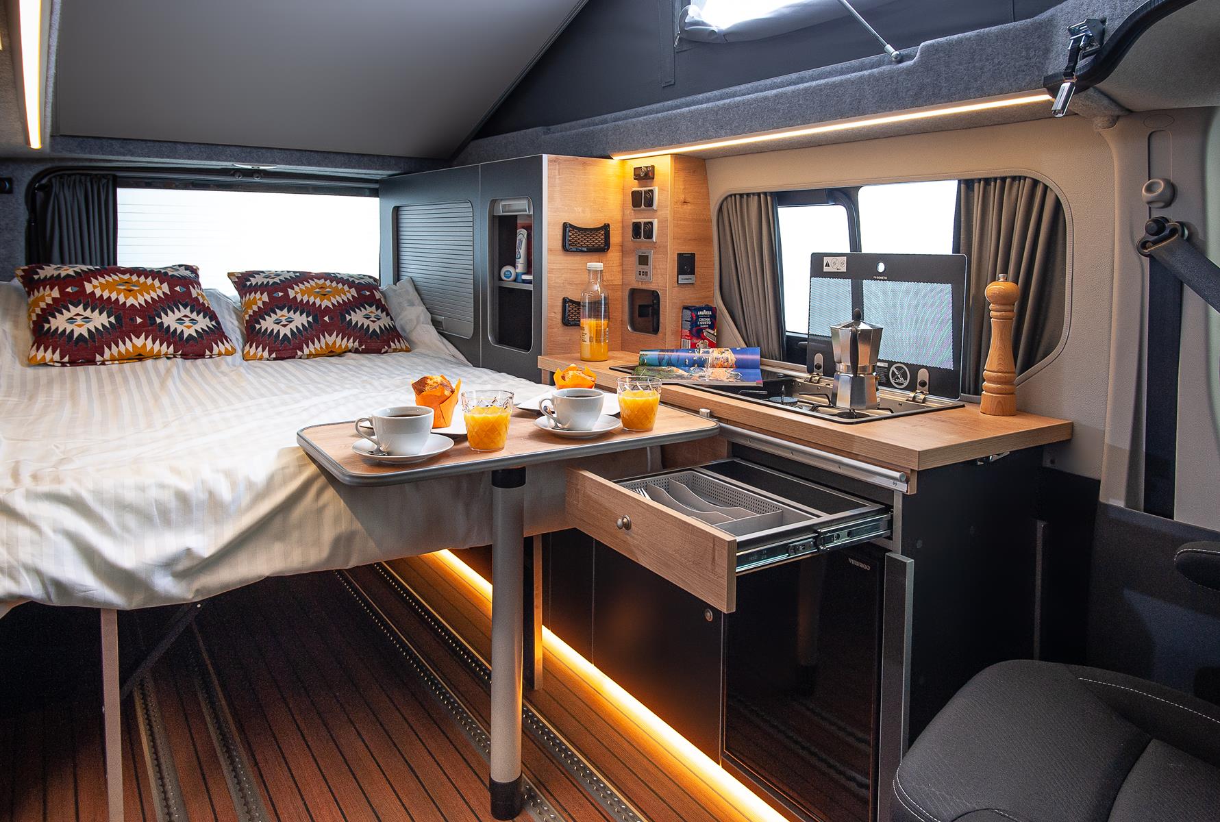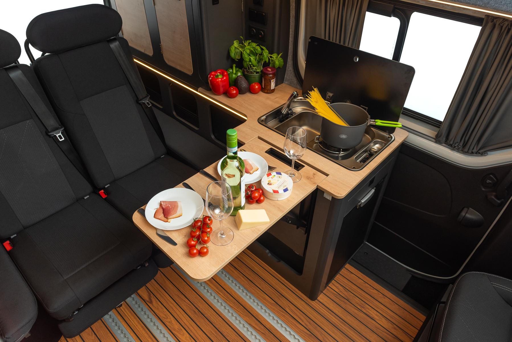 A new model featuring sliding doors on both sides of the vehicle and convenient outside access to the kitchen. Its innovative seats not only convert into a bed but also provide outstanding comfort for relaxation.