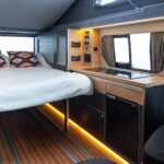 Seats in the first row overlooking the living area. The lower bed folded out. Second-row seats can be stowed side by side under the bed for easy access to cabinets from the living area. Expanded console. Free luggage compartment.
