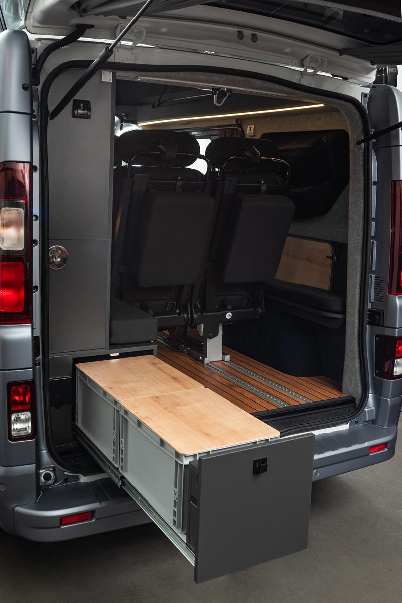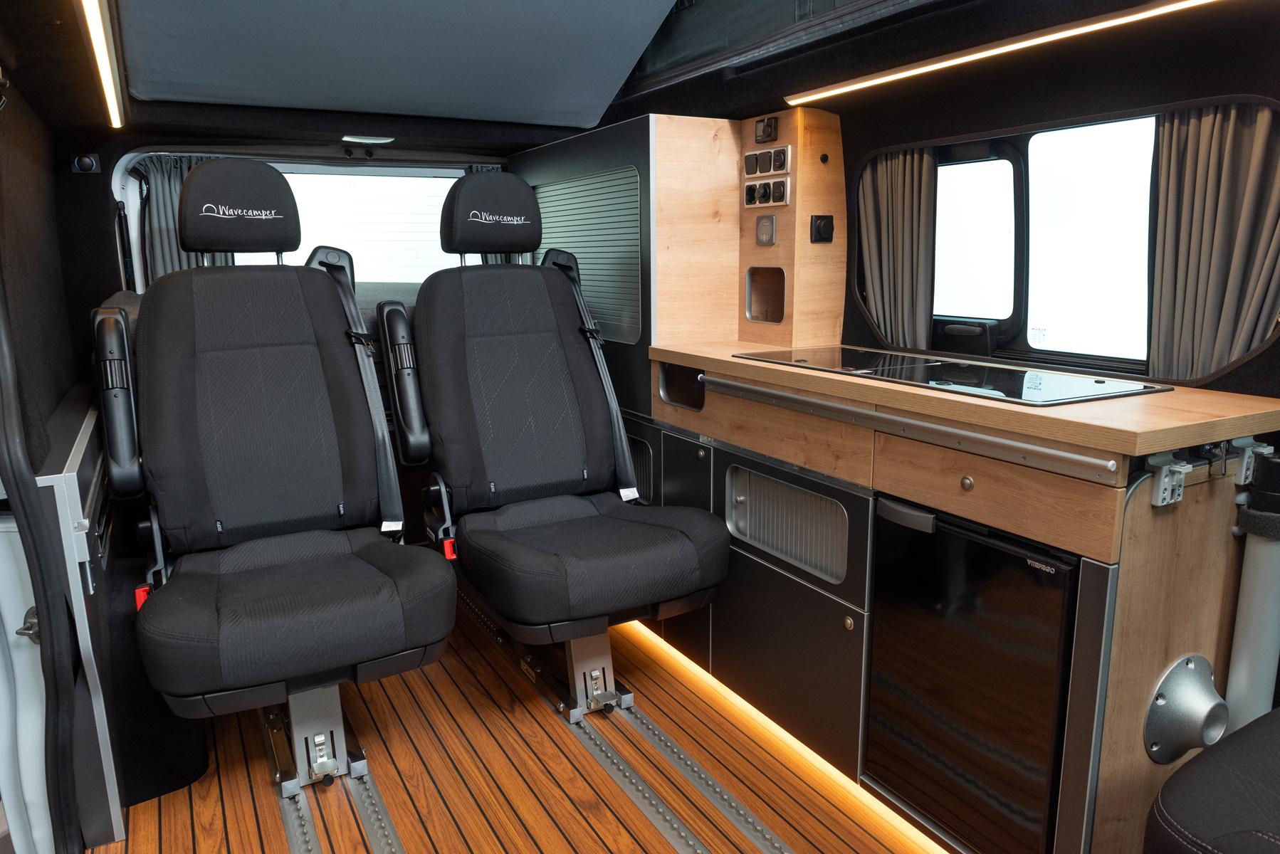 The renowned Wavecamper DNA has been applied to the popular Renault Trafic chassis, resulting in a vehicle that combines exceptional functionality with a flexible interior design. A key feature is the system of individual seats mounted on rails, enabling multiple configurations – from a 4-person camper with 4 sleeping places to a comfortable 6-person transporter. With the seats or bed removed, the interior transforms into a spacious cargo area, ideal for transporting larger items.