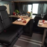 Seats in the first row facing the direction of the inside of the car. Second-row seats facing the direction of travel. Lower bed folded down. Table unfolded.