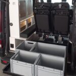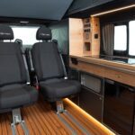 Front row seats facing forward. Other seats removed. Lower bed removed. Space for large items in the living area. Secure cargo attachment with fixing points along the entire length of the rail system.