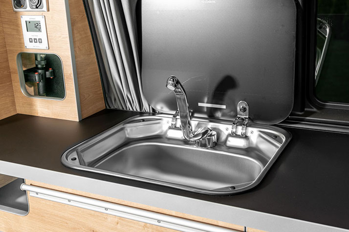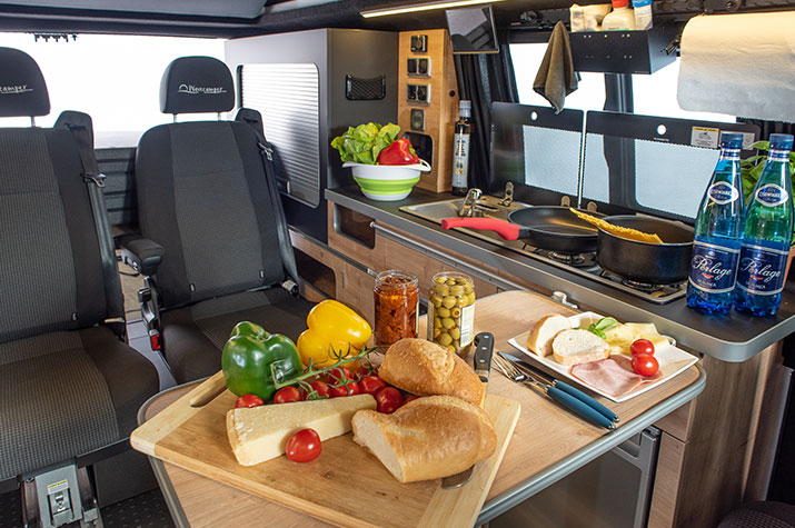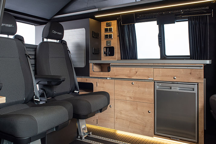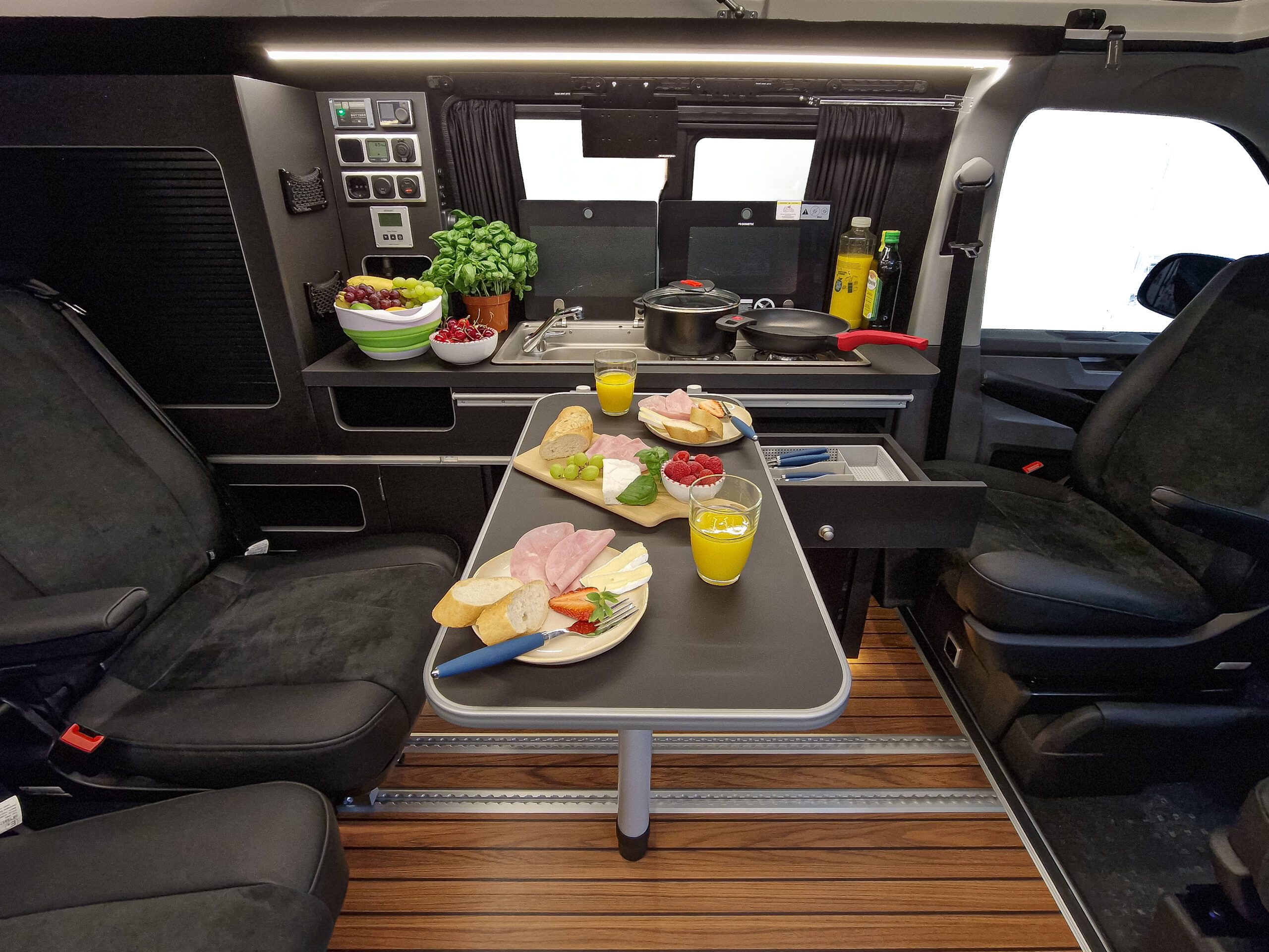 Seats in the first row overlooking the living area. The lower bed folds out. Second-row seats can be stowed side by side under the bed for easy access to cabinets from the living area. Expanded console. Free trunk.