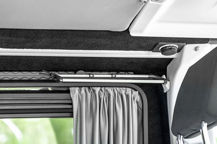 First-row seats facing the direction of travel. Lower bed folded down. Second-row seats tucked side by side under the bed. Space in the living area for transporting large items. Secure cargo attachment with fixing points along the entire length of the rail system.