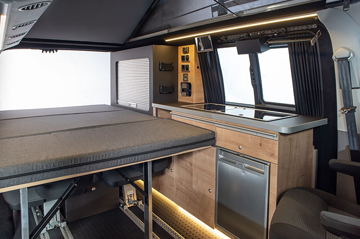 First-row seats facing the direction of travel. Lower bed unfolded. Second-row seats can be stowed one behind the other under the bed for convenient access to cabinets and luggage space from the living area.